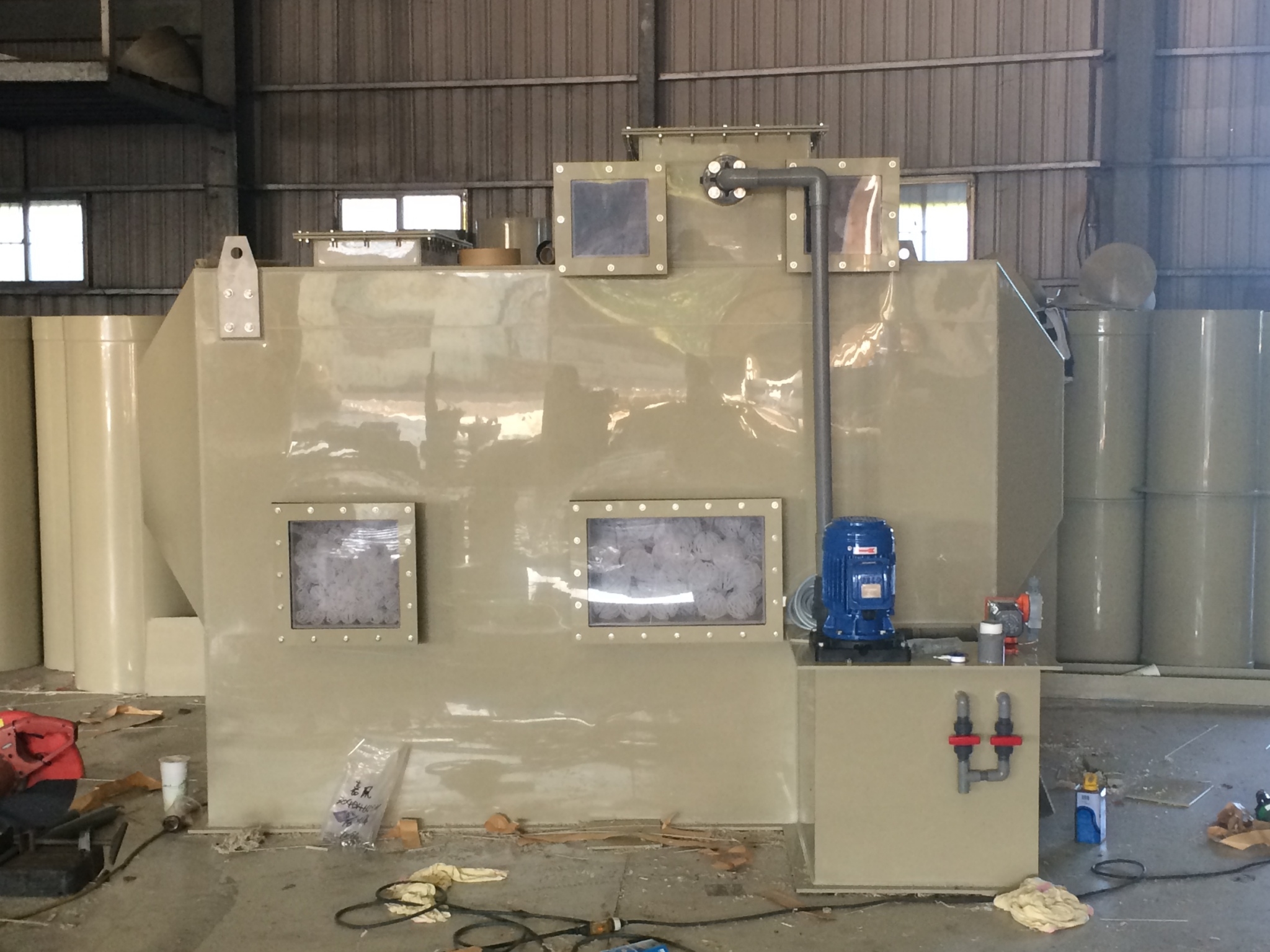 酸鹼氣體吸收利用酸鹼中和原理,酸性氣體使用鹼液吸收,鹼性氣體利用酸液吸收,酸鹼化學反應的吸收效率佳,合理的參數設計可達99%以上去除效率,園區半導體、光電、5G等廠家多 以使用濕式洗滌塔作為處理酸、鹼性氣體之空污防制設施。