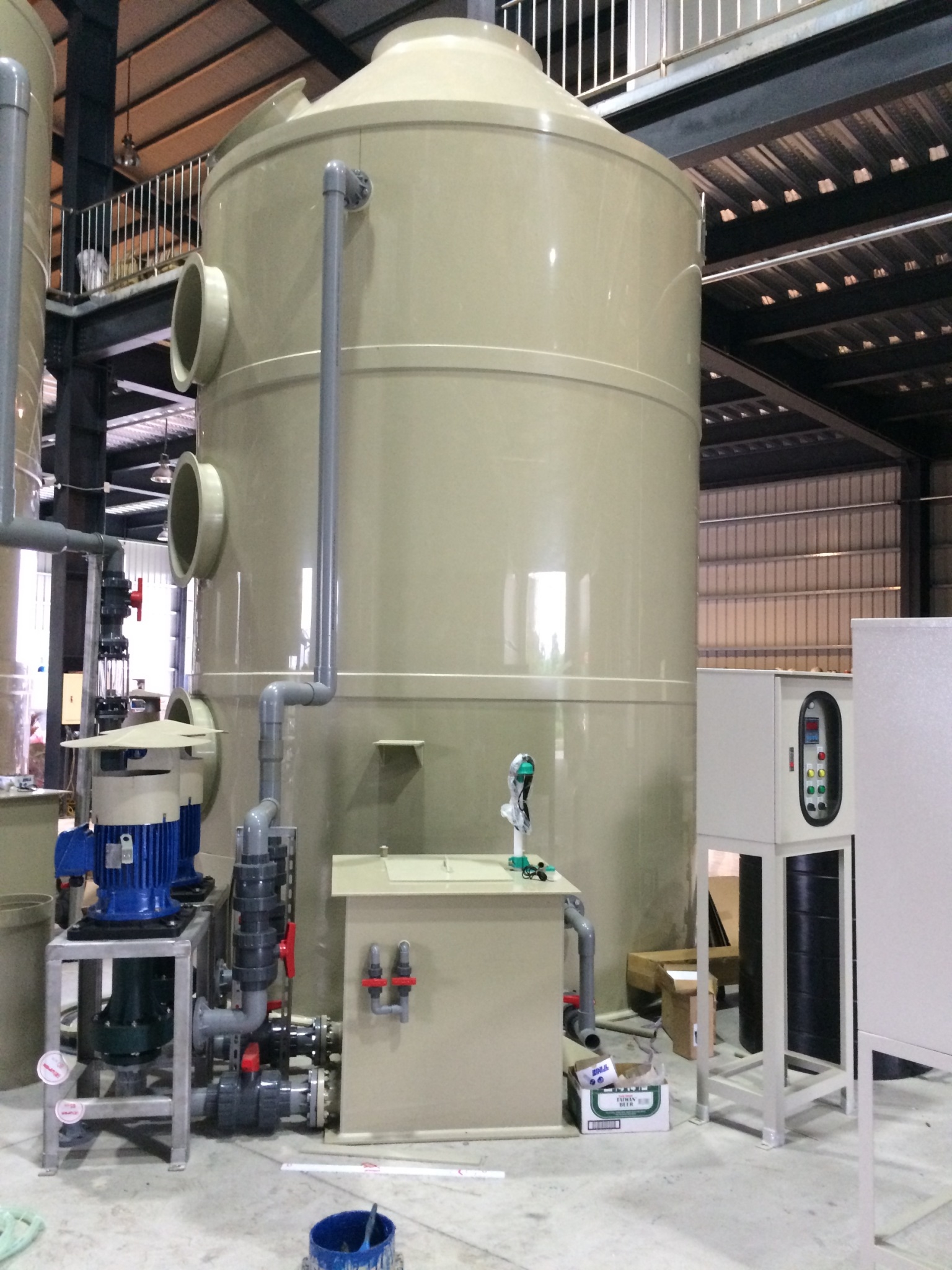 酸鹼氣體吸收利用酸鹼中和原理,酸性氣體使用鹼液吸收,鹼性氣體利用酸液吸收,酸鹼化學反應的吸收效率佳,合理的參數設計可達99%以上去除效率,園區半導體、光電、5G等廠家多 以使用濕式洗滌塔作為處理酸、鹼性氣體之空污防制設施。